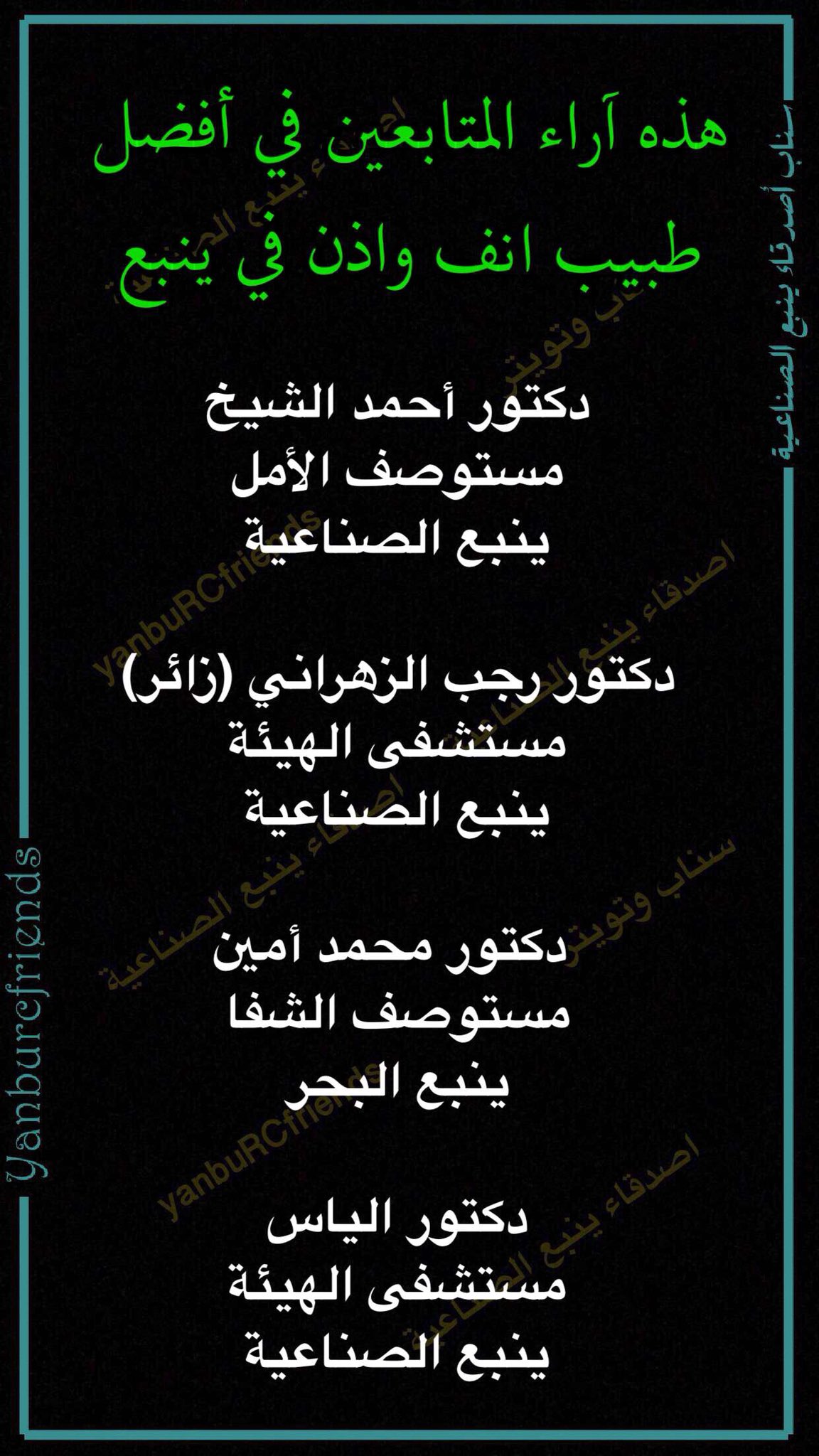 أصدقاء ينبع الصناعية On Twitter هذه آراء المتابعين حول أفضل أطباء الأنف والأذن والحنجرة في ينبع البحر ينبع الصناعيه الرجاء من ي رشح اسم اضافي أن يذكره ويذكر اسم المستشفى ليتم تحديث القائمة