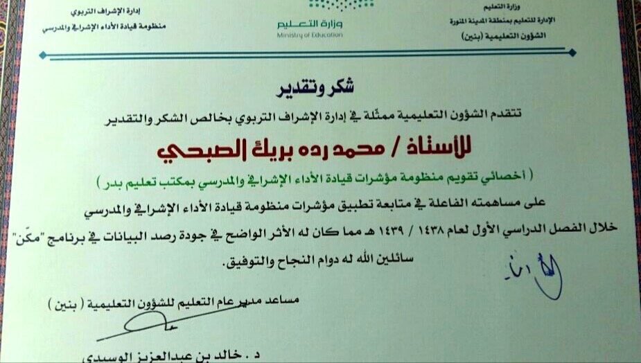 ملتقى قبيلة صبح On Twitter حصل الأستاذ محمد بن رده بن بريك الصبحي أخصائي تقويم منظومة مؤشرات الأداء الإشرافي بمكتب تعليم محافظة بدر على شهادة شكر وتقدير من الشؤون التعليمية للبنين بالإدارة العامة